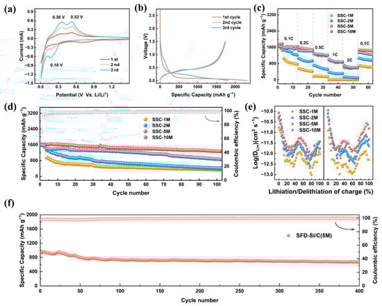 The CV profiles of SSC-5M were measured at a scanning rate of 0.1 mV s−1 over a voltage window of 0.005–1.5 V (Figure 4a). During the initial cathodic sweep, a broad reduction peak was observed between 0.5 and 1 V, corresponding with electrolyte decomposition and the formation of an SEI layer. The absence of this peak in subsequent cycles demonstrated the stability of the SEI layer established during the initial cycle [37]. Another cathodic peak was observed at approximately 0.18 V, corresponding with the alloying process of Si. During the anodic sweep, peaks at 0.36 V and 0.53 V corresponded with the oxidation-driven delithiation of LixSi [38,39]. Moreover, the redox peaks gradually increased in intensity with increasing cycle numbers, suggesting that the activity of the electrode material was progressively released. The galvanostatic charge–discharge (GCD) profiles of SSC-5M exhibited a discharge plateau at 0.8 V during the initial discharge, which vanished in later cycles, demonstrating the formation of a stable SEI layer (Figure 4b) [40]. In comparison, SSC-1M and SSC-2M lacked this distinctive 0.8 V plateau (Figure S7), suggesting their inability to establish a stable SEI layer. Figure 4b shows that SSC-5M had an initial discharge capacity of 1731.06 mAh g−1 and a coulombic efficiency of 74.94% (Figure 4b). The low initial coulombic efficiency (ICE) was primarily attributed to two factors: the trapping of Li+ by defects of the poorly graphitized carbon and excessive SEI formation caused by the carbon nanostructure [41].