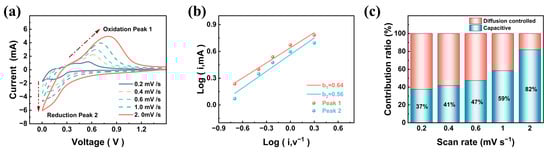 The CV tests were conducted at scan rates of 0.2–2 mV s−1 to examine the reaction kinetics and Li+ storage mechanism. Figure 5a shows that all CV curves had similar shapes, indicating that the SSC-5M electrode had high reversibility and low polarization. When the scan rate increased, the redox peaks of SSC-5M became more pronounced and shifted, covering a wider voltage range. Based on the calculation of b-values for the redox peaks using Equation S(4), values of 0.59 and 0.62 were obtained, respectively (Figure 5b). This suggests that Li+ storage in SSC-5M involved both diffusion-controlled and capacitive processes. As shown in Figure 5c, the capacitive contribution increased with the scan rate, with SSC-5M exhibiting a 59% capacitive contribution at 1 mV s−1. Compared with the other SSCs (Figure S8), it was found that the carbon nanosheets could provide higher capacitance. This could be attributed to the ultrathin carbon nanosheets, providing a large surface area with abundant active sites, and their unique two-dimensional structure, which significantly shortened the Li+ diffusion pathways [44].