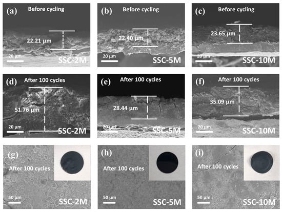 Cross-sectional SEM images of SSC-2M, SSC-5M, and SSC-10M electrodes (a–c) before cycling and (d–f) after 100 cycles. (g–i) Surface morphology SEM images of SSC-2M, SSC-5M, and SSC-10M electrodes after 100 cycles.