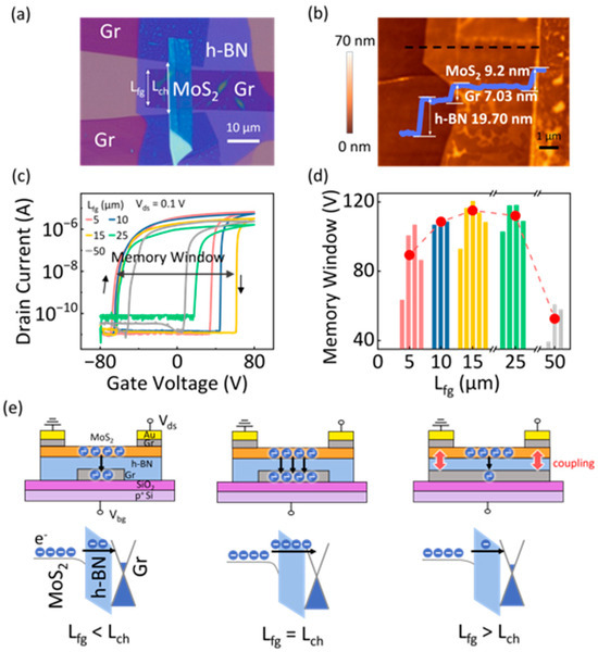 Therefore, to systematically investigate the influence of floating-gate topology on memory performance, devices with an elaborate design, for example, by varying the floating-gate length and the tunneling-layer thickness, were experimentally fabricated. At first, by adjusting the floating-gate length (Lfg), this study explored how structural variations impact the charge storage and MW characteristics. In this device series, the channel length was maintained at 15 µm, while the Lfg was varied symmetrically with respect to the S/D electrodes. The optical microscope (OM) image of a representative device is shown in Figure 2a, providing a clear view of the material stacking. Additionally, AFM was used to determine the thicknesses of the key layers in the device structure. As shown in Figure 2b, the thicknesses of MoS2, h-BN, and Gr flakes were 9.20 nm, 19.70 nm, and 7.03 nm, respectively. The output characteristic curves of the FGM device exhibited excellent linearity (Figure S1), indicating that the Gr S/D electrodes formed a high-quality ohmic contact with the MoS2 channel. Furthermore, Raman spectroscopy analysis demonstrated the high-quality vertical stacking of the constituent material layers in the FGM heterostructure (Figure S2). To evaluate the impact of Lfg on memory behavior, electrical measurements were performed under a ±80 V bidirectional back gate voltage (Vbg) sweep with a fixed drain voltage (Vds) of 0.1 V. As shown in Figure 2c, the measured transfer curves revealed significant variations in MW as the Lfg changed. The varying trend could be further visualized in the statistical results of 19 devices (Figure 2d). Initially, as the Lfg increased, the MW expanded, indicating enhanced charge storage capacity. However, when the Lfg approached or exceeded the channel length (Lch), a saturation phenomenon occurred, followed by a gradual MW decline. The working mechanism of the FGM devices was hypothesized to explain this phenomenon, as illustrated in Figure 2e. For devices with shorter floating gates, increasing the Lfg enhances the charge storage capability, leading to a gradual MW increase. However, as the Lfg extends closer to the S/D electrodes, electrostatic coupling intensifies, weakening the vertical electric field strength between the floating gate and channel, thereby hindering the electron tunneling process. Consequently, MW exhibits a saturation trend before gradually decreasing. These findings emphasize the crucial role of floating-gate topology in shaping memory performance in low-dimensional FGM devices [40].