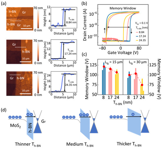 To further verify the above-mentioned hypothesis regarding the influence of electrostatic coupling between the floating gate and S/D electrodes, an in-depth investigation was performed on the charge storage characteristics by tuning the carrier tunneling behavior. Specifically, by systematically varying the thickness of the h-BN tunneling layer (Th-BN), how the floating-gate configuration impacts MW, particularly in the presence of electrostatic coupling effects, can be determined. For a fair comparison, two sets of devices were fabricated with the Lfg fixed at 15 μm and 30 μm. For each set, three different Th-BN were adopted, which were categorized as the thinner, medium, and thicker h-BN layer. The specific three thicknesses, such as 8.84 nm, 17.24 nm, and 24.35 nm, were further clarified using AFM analysis (Figure 3a). As a result, the measured transfer curves in Figure 3b clearly illustrated significant variations in MW as the Th-BN changed. The extracted MW trends are summarized in Figure 3c, revealing distinct behaviors for the two Lfg sets. Specifically, for devices with Lfg = 15 μm, MW exhibited a monotonic decrease as the Th-BN increased. In contrast, for devices with Lfg = 30 μm, MW followed a hump-shaped trend, initially increasing before gradually declining as the Th-BN continued to rise. The physical mechanisms underlying this behavior are illustrated in Figure 3d. Taking devices with a longer Lfg (30 μm) as an example, when Th-BN is relatively thin, the floating gate is in closer proximity to the S/D electrodes, resulting in a stronger electrostatic coupling effect. This enhanced coupling weakens the vertical electric field between the floating gate and the MoS2 channel, thereby reducing the effectiveness of electron tunneling and leading to a lower MW. As Th-BN increases, the electrostatic coupling effect is progressively mitigated, which in turn strengthens the vertical electric field, allowing for improved charge storage and an increase in MW. However, as Th-BN continues to increase, the widening of the tunneling barrier eventually suppresses electron tunneling, leading to a gradual decrease in MW. This trend indicates that while an optimal Th-BN can enhance memory performance by balancing the tunneling efficiency and electrostatic effects, excessive thickness ultimately hinders charge trapping due to increased energy barriers. These findings provide further evidence of the crucial role that electrostatic coupling plays in shaping charge storage behavior in FGM devices. Understanding the interplay between Lfg, Th-BN, and electrostatic effects offers valuable insights for optimizing the tunneling layer design to achieve improved memory performance in low-dimensional memory devices.