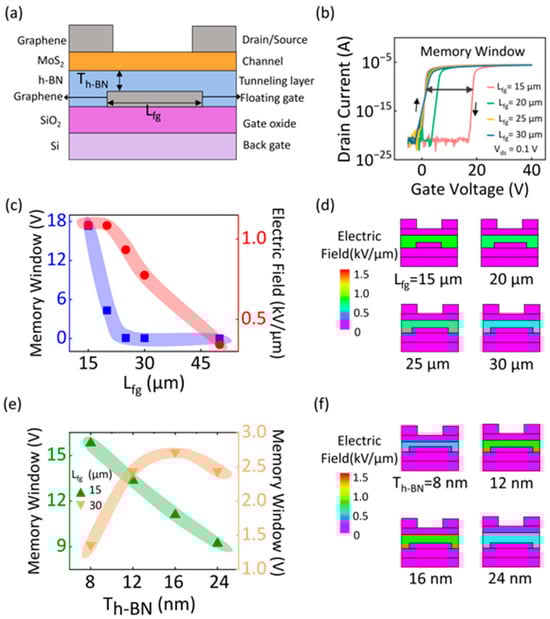 (a) The device structure and (b) recorded transfer curves for device simulation. (c) The evolution of the MW and electric field over the tunneling layer after programming as a function of Lfg. (d) Simulated electric field distribution for devices with different Lfg (15, 20, 25, 30, and 50 μm). (e) The evolution of the MW over the tunneling layer after programming as a function of Th-BN for the Lfg of 15 μm and 30 μm. (f) Simulated electric field distribution for devices with different Th-BN (8, 12, 16, and 24 nm).