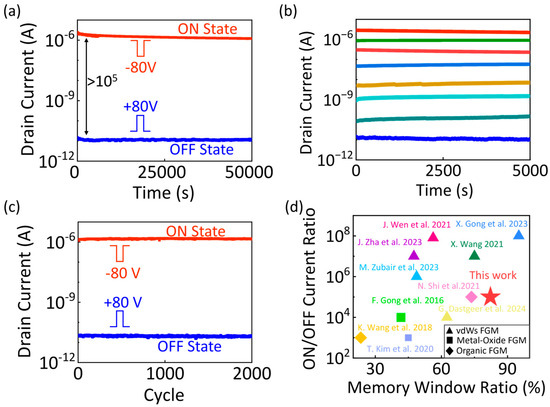 (a) Retention characteristic of the vdWs FGM under ON and OFF states with an operating gate voltage of −80 and 80 V, respectively (Vds = 0.1 V). (b) Multi-bit storage function with 8 distinct states under different gate voltage pulses (from top to bottom: −80, 20, 25, 27, 29, 30, 31, and 80 V, pulse width = 1 ms). (c) Endurance characteristic of the vdWs FGM under cyclic programming and erasing operations (Vbg = ±80 V, 1 ms; Vds = 0.1 V. (d) ON/OFF current ratio and MW ratio (the ratio of memory window size to swept voltage range) benchmark of the FGM devices [16,28,46,47,48,49,50,51,52].