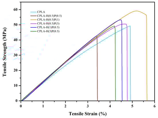 The stiff nature of HNC can lead to the enhancement of the mechanical strength of the composite. Guo et al. reported the effect of HNT in improving the mechanical strength of PLA matrix at low loadings [45]. Also, the formation of fibrillated PTFE in the PLA matrix can cause plastic deformation in the PTFE’s vicinity, thereby creating stronger composites [46]. PLA-H(0.5)P(1) showed the highest tensile strength of 59.1 MPa. However, the tensile strength gradually decreased for all other filler ratios. This reveals that PLA-H(0.5)P(1) is the optimum concentration for the PLA/HNC/PTFE system which is attributed to the uniform dispersion and most favorable interfacial compatibility between halloysite nanoclay, PTFE, and PLA. The enhancement in tensile strength results is due to the increase in contact surface area and the interaction between the filler and the polymer matrix. This result is also in support of the SEM morphology. The addition of a higher concentration of filler can lead to agglomerates which form premature cracks due to the excessive stress concentration around agglomerates and poor adhesion between nanoclay, PTFE, and PLA. This consequently reduces the tensile strength of the composites.