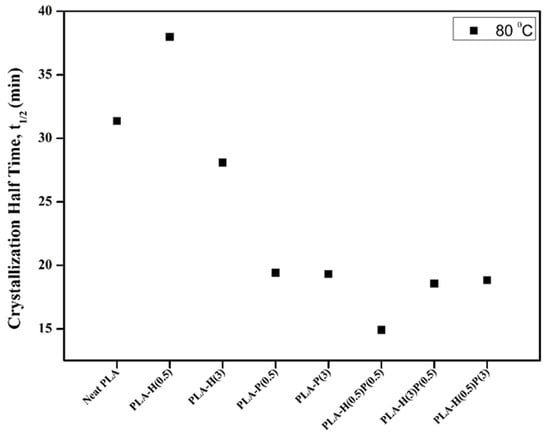 The half-time crystallization is usually measured because it includes both the changes in the nucleation of crystallization and the changes in the onset of crystallization. In Figure 8 the half-time crystallization data of PLA and all composites are shown. The samples were melted by heating to 200 °C and then cooling down to 80 °C to register the crystallization heat release.