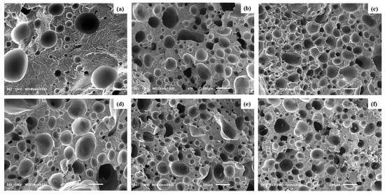 where represents the number of cells in the SEM image, and is the area of the image (in cm2). and denote the densities of composite and foamed samples, respectively [40]. SEM images with ×75 magnification possessing approximately 120 to 170 cells per image were used for analysis. signifies the void fraction and was determined using Equation (4):