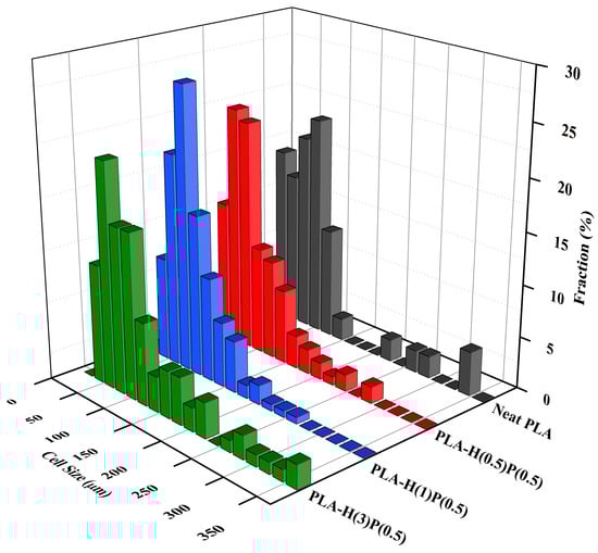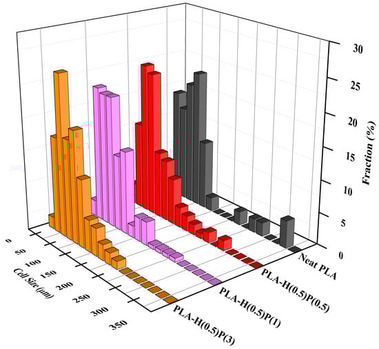 Cell size concentration graphs of foamed PLA nanocomposites consisting of a fixed amount of PTFE (0.5%) and increasing amount of halloysite: PLA-H(0.5)P(0.5), PLA-H(1)P(0.5), and PLA-H(3)P(0.5). A foam of neat PLA is included for comparison.