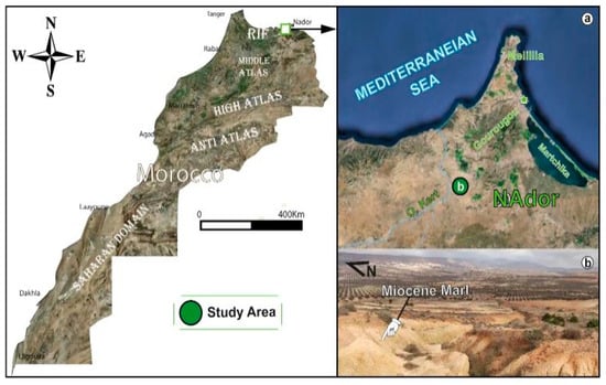 Geographical and geological location of the Miocene marl mining area near Nador, Morocco, with a detailed map of the coastal region (a) and a view of the mining site near a dam (b).