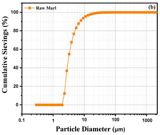 Laser Granulometry of raw marl: (a) volumetric percentage vs. particle size; (b) cumulative granulometric distribution vs. particle diameter.