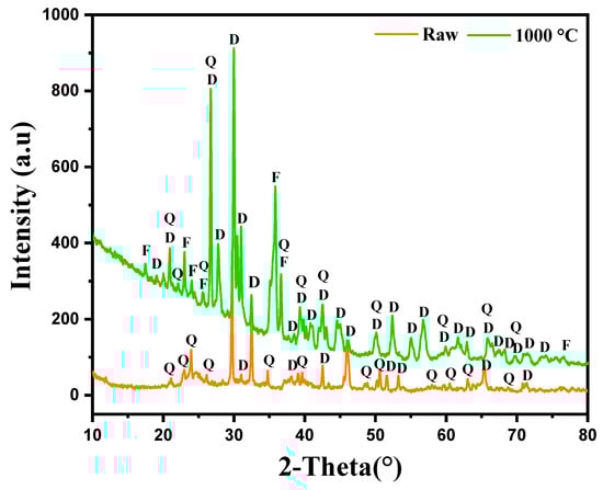 The XRD analysis conducted on the marl modified with diopside, both in its raw state and after calcination at 1000 °C, highlighted the presence of various mineral phases, their evolution and changes in peak positions after heat treatment, as illustrated in Figure 3. In the raw sample, the XRD results reveal the presence of two main phases: Quartz (Q) and diopside (D). The characteristic peaks of these phases are clearly visible on the diffractogram; Quartz, in a stable phase at room temperature, shows its most intense peak around 2θ = 26.6°. Diopside, on the other hand, displays lower-intensity peaks, suggesting it is present but not yet fully crystallized, or in a lower proportion within the marl matrix. After calcination at 1000 °C, the diffractogram shows significant changes in the sample’s crystalline structure. The intensity of the peaks corresponding to diopside (D) increases markedly, indicating enhanced crystallization of this phase due to the effect of temperature. Quartz (Q), though still present, does not show a significant variation in peak intensity, suggesting that this phase remains stable post-calcination. An additional phenomenon observed after calcination is the shift of certain peaks toward lower angles, particularly for diopside. This shift may indicate changes in the crystal lattice parameters, likely related to thermal relaxation or changes in the chemical composition of the phases under the effect of temperature. Such shifts are often observed when elements diffuse or rearrange within the crystal lattice during thermal treatment. Furthermore, new peaks appear after calcination, corresponding to the formation of Forsterite (F). Forsterite, a magnesium-rich mineral phase, generally forms at high temperatures from magnesium and silicon compounds present in the marl. Its formation indicates significant thermal transformations at 1000 °C, favoring the emergence of this new crystalline phase.