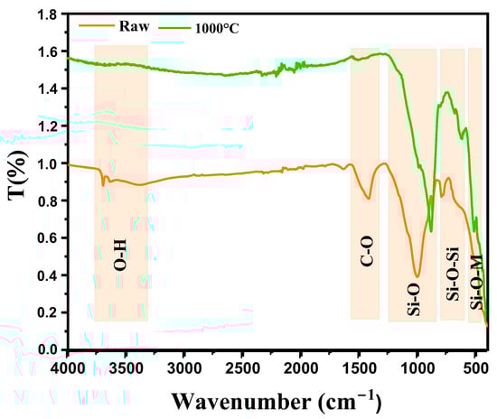 Figure 4 shows the analysis of the infrared (IR) bands observed in diopside-based marl (CaMgSi2O6), both in its raw state and after thermal treatment at 1000 °C, revealing significant structural changes. In the raw state, the band at 3444 cm−1 likely corresponds to O-H vibrations from hydroxyl groups or adsorbed water, suggesting residual moisture or hydroxyls typical in unheated clay or marl materials [16]. The band at 1425 cm−1 is generally associated with carbonate (C-O) group vibrations, often as impurities in marl, indicating residual carbonates like CaCO3 that have not yet decomposed [17]. The band at 999.17 cm−1 is attributed to asymmetric stretching vibrations of Si-O bonds within the silicate network of the diopside structure, reflecting the SiO4 tetrahedral structure of the marl’s silicate phase. The band at 792.33 cm−1 corresponds to Si-O-Si vibrations in silicate networks, typical of silicates like diopside, representing interactions between SiO4 tetrahedra in the material structure [18,19]. After thermal treatment at 1000 °C, new bands appear, indicating structural modifications. The band at 881 cm−1 could be related to increased crystallization or reorganization of the silicate network, possibly indicating a more stable phase or reorganization of the SiO4 tetrahedra typical of diopside transformation after heating. The band at 621 cm−1, corresponding to Si-O deformations within silicate networks, suggests structural modifications with increased crystallization and improved thermal stabilization of diopside [20]. The band at 512 cm−1 is associated with bending vibrations of Si-O-M bonds (M being a metal such as Ca or Mg) within the crystal network, becoming more pronounced in post-thermal treatment, indicating a crystalline reorganization and better alignment of metal ions with the SiO4 tetrahedra [21].