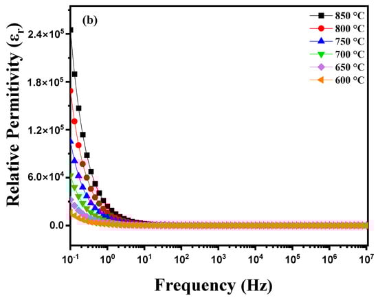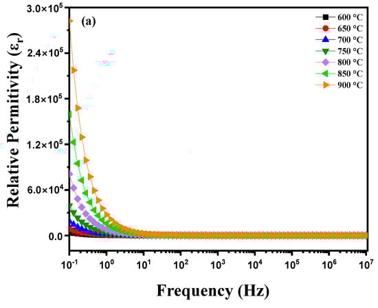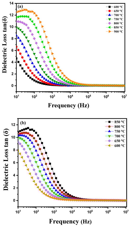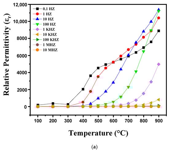 Figure 8a,b shows the variations in dielectric losses and dielectric constant (εr) as a function of temperature ranging from 100 °C to 900 °C at different frequencies (0.1 Hz. 1 Hz. 10 Hz. 100 Hz. 1 kHz. 10 kHz. 100 kHz. 1 MHz. 10 MHz). Distinct behaviors are observed in these variations. Between 100 °C and 300 °C, variations in the dielectric constant (εr) and dielectric losses (tanδ) are relatively small and stable, which suggests that the polarization mechanisms remain stable and are barely influenced by frequency in this interval. The dipoles are partially misaligned and fail to align effectively under the electric field due to insufficient thermal energy at these temperatures. Thus, at this temperature, the dielectric properties initially decrease before showing a slight increase as thermal energy allows for better polarization. Above 300 °C, the dielectric constant and dielectric losses increase significantly with temperature. This behavior is attributed to temperature-dependent dipolar polarization, where the dipoles align more efficiently with the electric field as the thermal energy increases. At the same time, electrical conduction is amplified, which also increases εr and tanδ. Ceramics then undergo significant structural transitions, such as dehydration or changes in crystalline phases, which contribute to increased dielectric losses and increased dielectric constant. This phenomenon continues up to temperatures close to 900 °C, where the dielectric properties tend to stabilize or decrease slightly due to major transformations of the material [31,32].