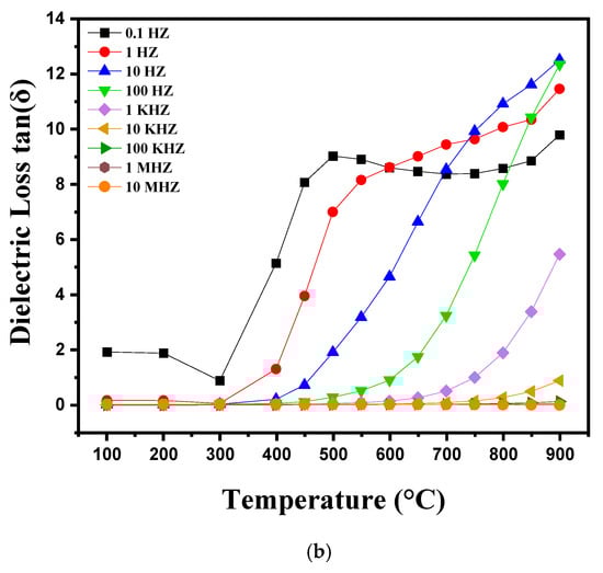 Diagram showing the evolution of (a) relative permittivity and (b) dielectric loss as a function of temperature, from 100 °C to 900 °C, as well as frequency variation.