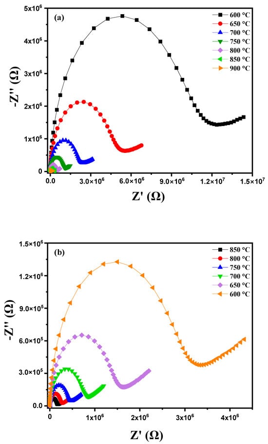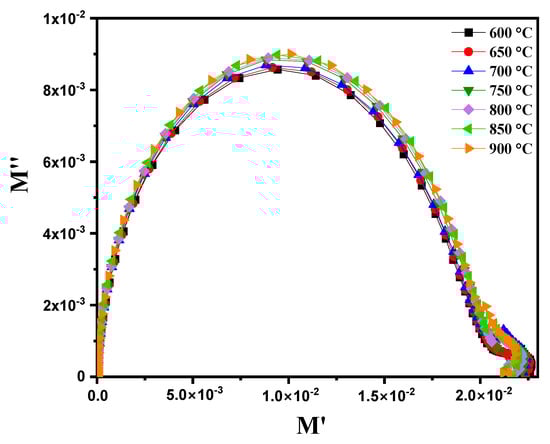 When representing the variation in M″ (the imaginary part of the complex permittivity) as a function of M′ (the real part of the complex permittivity) at different temperatures ranging from 600 °C to 900 °C, Figure 15 highlights the appearance of several semicircles on the Nyquist diagram. This observation indicates significant changes in the dielectric response of the material as a function of the temperature. The semicircles are clearly separated in this compound. These results confirm the equivalent circuit presented in Figure 9c, which is not visible in the Nyquist impedance diagram for these materials [60].