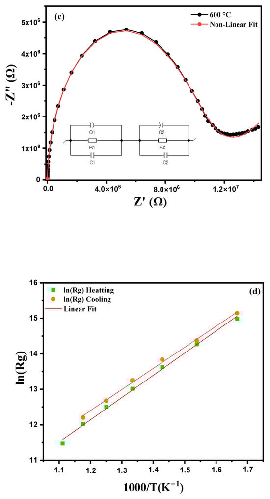 In material studies, an equivalent circuit model is often used to represent the complex electrical properties of grains and grain boundaries. This circuit, expressed as Q1/R1/C1 + Q2/R2/C2 segments the electrical response of the material into various distinct components each capturing a particular aspect of the electrical behavior. Additionally, Z-View software (version 4.0) allows for the adjustment of the parameters of each element in this circuit, providing a precise optimization of the fit between experimental data and the model shown in Figure 9c. This model can be described by a series circuit consisting of two distinct branches. The cell Q1/R1/C1 models the response of the grain boundaries and the interfaces between the grains of the material. Q1: This is a constant phase element (CPE) used to model irregularities in charge distribution at the grain boundaries. R1 represents the resistance of the grain boundaries. Grain boundaries are often more resistive due to the presence of structural defects or impurities which increase the resistance to electrical conduction at these interfaces. C1 corresponds to the capacitance of the grain boundaries. This capacitance reflects the accumulation of charges at the grain interface, causing a capacitive effect due to the difficulty in transporting charges across the grain boundaries. The second branch of the circuit, Q2/R2/C2, describes the response of the grains in the material, which are generally more conductive than the grain boundaries. Q2: This constant phase element (CPE) models the slightly non-ideal electrochemical response within the grains. Although conduction is more homogeneous in the grains, minor imperfections justify the use of a CPE. R2 represents the internal resistance of the grains. Grains that are more conductive than the grain boundaries have a lower resistance, facilitating the conduction of charges through them. C2 corresponds to the capacitance within the grains [37]. This capacitance is related to charge polarization in the grains, but it is typically less pronounced than in the grain boundaries. The constant phase element (CPE) is used in grains and grain boundaries to model their non-ideal capacitive behavior. This non-idealism may result from the presence of several distinct relaxation processes [38,39]. The capacitance C and the value of the constant phase element (CPE) are linked by the following formula: