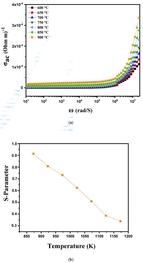 (a) AC conductivity as a function of frequency at different temperatures from 600 °C to 900 °C for modified marl and (b) variation in the “s” parameter with temperature.