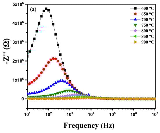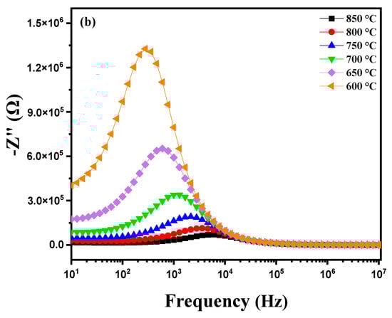 Diagram of the variation in the imaginary part of impedance (Z″) as a function of frequency: (a) heating curve from 600 °C to 900 °C and (b) cooling curve from 850 °C to 600 °C for modified marl.