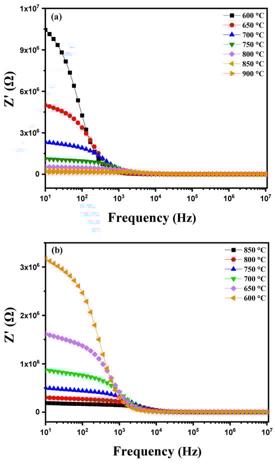 Diagram of the variation in the real part of impedance (Z′) as a function of frequency: (a) heating curve from 600 °C to 900 °C and (b) cooling curve from 850 °C to 600 °C for modified marl.