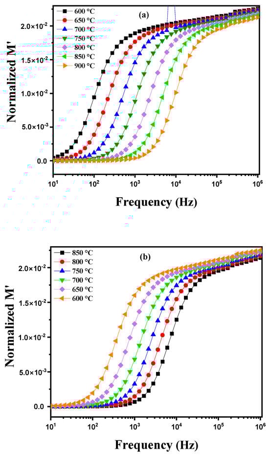 Real part of the modulus M′ as a function of frequency at different temperatures: (a) heating curve (600–900 °C) and (b) cooling curve (850–600 °C) for modified marl.