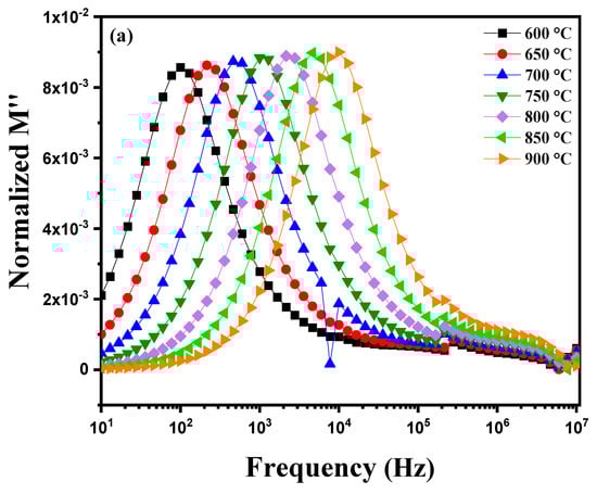 Figure 16 shows the evolution of the imaginary part of the normalized impedance (Z″/Z″max) and the normalized electrical modulus (M″/M″max) as a function of frequency, covering a range from 1 Hz to 1 MHz at a temperature of 900 °C. Characteristics indicative of the material’s dielectric properties are observed. The imaginary part of the impedance (Z″) reflects energy losses due to relaxation and conduction processes, showing peaks at specific frequencies where these losses are maximal, often linked to specific relaxations or conduction transitions. Similarly, the normalized electrical modulus (M″) reveals frequencies of maximum losses, reflecting phenomena similar to those observed in Z″. When the peaks of Z″/Z″max and M″/M″max are very close, it indicates that the relaxation processes influencing dielectric and impedance losses are similar, suggesting a strong interaction between polarization and conduction phenomena. This peak proximity may be due to relaxations that similarly affect both the imaginary part of the impedance and the electrical modulus, indicating that these phenomena occur at close frequencies. Closely spaced peaks in Z″/Z″max and M″/M″max at 900 °C reflect common relaxation and conduction processes, highlighting the complexity of the material’s electromagnetic properties at high temperatures and suggesting the coexistence of localized and extended relaxations [61]. This absence of a superposition of the Z″ and M″ peaks again suggests a deviation from the ideal Debye-type behavior in our ceramics [62].
