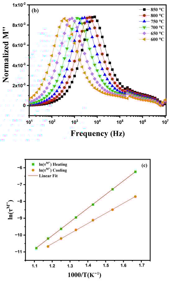 Imaginary part of the modulus M″ as a function of frequency at different temperatures: (a) heating curve (600–900 °C). (b) cooling curve (850–600 °C) and (c) plot of ln(στM″) as a function of the inverse temperature, 1000/T, for modified marl.