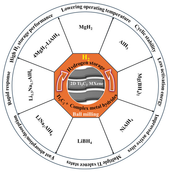 Due to the key structural and surface termination features of Ti3C2 MXene, the combination of Ti3C2 MXene and metal hydrides strengthens the overall H2 storage capacity. Specifically, the Ti3C2 MXene has the ability to reduce the desorption temperature of metal hydrides as a potential catalyst by the creation of Ti metal and various Ti valance states (Ti0, Ti2+, Ti3+, and Ti4+). Moreover, Ti3C2 MXene stabilizes the H2 desorption of metal hydrides and increases the cyclic stability of the resultant composite. It should be noted that the diffusion of hydrogen molecules can be significantly improved in metal hydrides by the addition of Ti3C2 MXene to improve the absorption/desorption kinetics. Thus, the Ti3C2 MXene/metal hydride combination results in improved H2 storage performance at lower temperatures, compared with pure metal hydrides, especially for its applicability in automobile industry.