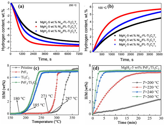 - Wang, Y.; Fan, G.; Zhang, D.; Fan, Y.; Liu, B. Striking enhanced effect of PrF3 particles on Ti3C2 MXene for hydrogen storage properties of MgH2. J. Alloys Compd. 2022, 914, 165291. [Google Scholar] [CrossRef]