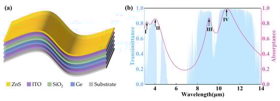 To meet the demands of large-scale engineering applications, and address the limitations of traditional metal–dielectric–metal (MDM) structures, such as a narrow working bandwidth and full width at half maximum (FWHM), this study proposes a multilayer thin-film structure composed of metal–dielectric–dielectric–metal–dielectric (MDDMD) that constructs a gradient refractive index for precise manipulation of electromagnetic waves. The design scheme for achieving dual-band wide-spectrum infrared absorption is presented in Figure 1a. Considering the unique plasma resonance characteristics of indium tin oxide (ITO), it demonstrates pronounced metallic behavior in the infrared band [36,37]. Therefore, ITO is selected as a reflective and lossy metallic material [38]. To achieve and optimize selective absorption performance, the dielectric layer is the key part of the structure, and its material selection is very important. The core dielectric layer is composed of germanium (Ge), which exhibits exceptional transparency, a high refractive index (n ≈ 4.2), and negligible dispersion in the infrared band, thereby providing an ideal foundation for selective absorption. Additionally, silicon dioxide (SiO2) and zinc sulfide (ZnS) are incorporated as auxiliary dielectric layers. Silicon dioxide exhibits local dispersion within the target band, whereas ZnS is dispersionless across the entire spectrum. The coordinated action of these dielectric materials enables precise regulation of impedance matching, effectively achieving selective absorption and broadening the absorption bandwidth.