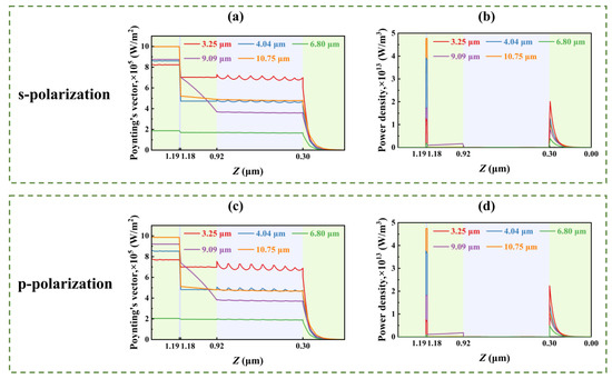 Poynting vectors and loss distributions along the vertical direction (i.e., z-axis) of the multilayer film at different wavelengths of 3.35 μm, 4.04 μm, 6.8 μm, 9.09 μm, and 10.75 μm: (a) Poynting vector (s-polarization); (b) electromagnetic loss (s-polarization); (c) Poynting vector (p-polarization); (d) electromagnetic loss (p-polarization). Note that the top surface of the film is at the left boundary.