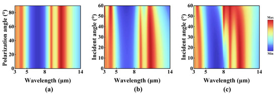 In practical engineering applications, the incident optical field frequently demonstrates complex characteristics, such as arbitrary polarization states and wide angular distributions. Consequently, the robustness of infrared-absorbing materials to the polarization direction and incident angle has become a critical technical indicator. Hence, this study systematically evaluates the sensitivity of the designed structure to polarization states and incident angles. Figure 4a depicts the absorption spectra of the structure under different polarization modes. As the polarization direction of the incident wave is continuously rotated from s-polarization to p-polarization, the absorption spectra show negligible shifts and amplitude attenuations. The absorption peak positions and amplitudes remain stable across the entire testing frequency range, indicating that the structure exhibits high insensitivity to incident light with arbitrary polarization states.