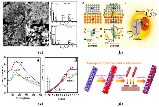 In recent years, the research of nanostructure photoelectric catalysts has made important progress, especially in the modification of semiconductor materials [26], the analysis of catalytic mechanisms [27], and the expansion of applications [28], in which researchers have proposed a variety of innovative strategies. For example, precious metal co-catalysts were introduced [10]. As shown in Figure 2a, SEM images of Ag and Ce-doped WO3 and GO nanostructured catalysts are presented to show their microstructures. In addition, a Z-type heterostructure is constructed [29]. As shown in Figure 2b, a Z-type heterojunction of ZnS/ZIS (n−n+) is constructed in ZnS/ZIS-3, and it contains non-metallic elements [30]. As shown in Figure 2c, the UV-Vis spectrum of the g-C3N4 material doped with B and O is presented [31,32]. As shown in Figure 2d, the use of the plasma effect is a new synthesis method of core-shell structure nanomaterials with surface plasma. These strategies have effectively improved the stability of photoelectric catalytic materials, the separation efficiency of photogenerated carriers, and the catalytic selectivity of target molecules [33]. In terms of applications, the nanostructured photocatalytic catalysts have been widely used in organic pollutant degradation [34,35], air purification [36,37], carbon dioxide reduction [38,39], water decomposition and hydrogen production [40,41], photoelectric cells [42], and energy storage devices [43], etc. However, the field still faces some challenges, such as low quantum efficiency [44], photocorrosion [45,46], insufficient stability [47], and high industrialization preparation costs [48], etc. Therefore, future research will pay more attention to the development of high-efficiency catalysts, the in-depth understanding of catalytic mechanisms, the introduction of intelligent catalytic technologies, and the feasibility of large-scale applications so as to promote the practical application of photocatalytic technology.