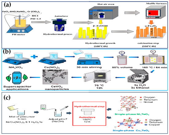 Hydrothermal synthesis of nanostructured photocatalysts. (a) Reproduced from Ref. [64] with permission from Springer Nature, copyright 2025; (b) Reproduced from Ref. [65] with permission from Elsevier, copyright 2025; (c) Reproduced from Ref. [66] with permission from ACS, copyright 2025.