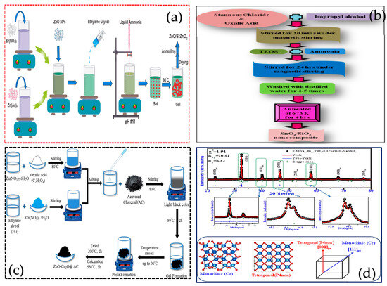 The sol-gel method, a wet chemical synthesis technology based on the hydrolysis and gelation of metal precursors, is suitable for preparing uniformly dispersed metal oxide catalysts. It enables precise control of the chemical composition and impurity elements and is amenable to large-scale production. Ahmad et al. [67] used Zn(CH3COOH)2 and Sr(NO3)2 as precursors to form a soluble gel by adjusting the pH to 11 and then added 0.5 g of ZnO. After gelation at 90 °C, the mixture was calcined at 300 °C for 2 h (Figure 5b). The resulting composite exhibited the potential to mineralize toxic dyes and kill pathogenic microorganisms. Giordano et al. [68] synthesized metal nitrides and metal carbides using the sol-gel method, and their catalytic performance was improved due to the larger surface area of these materials and the easier formation of small particles. Kumar et al. [15] co-precipitated tin dichloride (SnCl2), oxalic acid (C2H2O4), ethyl orthosilicate (Si(OEt)4)/isopropanol (C3H8O), and ammonia water, and then stirred the mixture for 24 h. After that, the mixture was fired at 673 K for 4 h to obtain the composite material SnO2/SiO2 (as shown in Figure 5a). Compared with the single SnO2, the composite material exhibited an approximately five-fold increase in surface area and enhanced electro-optical performance. Laghrib et al. [69] synthesized Mn-doped TiO2, Sn-doped TiO2, and Mn-Sn co-doped TiO2 using the sol-gel method. The precursor was titanium tetrakis (2-propanolato). After hydrolysis with acetic acid, gelation occurred, and then MnCl2 and SnCl2 were added for doping. The mixture was calcined at 500 °C for 2 h to obtain a photocatalytic material with a doping amount of 0.5–1%. The Mn and Sn co-doped TiO2 material resulted in a decrease in band gap energy and an increase in the decomposition rate of methylene blue per unit time. Martin Mark et al. [70] used the sol-gel method to prepare Sn-doped (1–5 wt%) NiMn2O4 nanoparticles. The doping of Sn reduced the band gap of NiMn2O4 from 2.17 eV to 1.85 eV. Moreover, the 5% doped sample exhibited a specific capacitance of 758 F/g at 1 A/g. Additionally, within 120 min, the photocatalytic degradation rates of MO and RhB were 91% and 97%, respectively. These results demonstrate the potential for the synergistic application of efficient energy storage and photocatalysis. Chitalkar et al. [71] successfully constructed a new ternary ZnO-Cu2O@AC photocatalyst. Compared with the binary ZnO-Cu2O composite material, its degradation rate of RhB can reach 99.87%, as shown in Figure 5c. This is mainly attributed to the enhanced visible light absorption, rich surface active sites, and efficient e−-h+ separation. These characteristics have provided a new type of model material for low-cost water remediation. Satyanarayana et al. [72] used acetate as the precursor, which was first gelatinized and then calcined in multiple steps (450 °C/4 h, 900 °C/3 h) to obtain high-purity 0.63Na0.5Bi0.5TiO3-0.37SrTiO3-NaNbO3 ceramics, as shown in Figure 5d. This process improved the overall energy storage performance of these ceramics. The sol-gel method prepares materials with high homogeneity, can be performed at room temperature and pressure, is chemically stable, is low cost, and has good reproducibility. However, the gel time is long, and the drying and curing are prone to defects. In large-scale production, the uniformity and consistency of the drying and curing process are difficult to control, limiting scalability. The catalyst can be filtered and centrifuged for recovery, but the powdered form is easy to dust and lose, and the surface is easy to adsorb intermediates, or the structure collapses and clogs the pores after many cycles, so that the activity and the recycling efficiency are reduced. Materials synthesized in this way can degrade some organic pollutants by up to 80–95%.