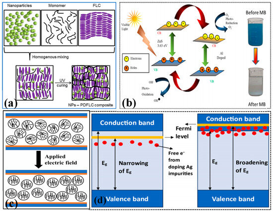 Doping can adjust the energy band structure of materials, improving light absorption and carrier separation efficiency. Butt et al. [94] synthesized LaCeO3 and B-site doped (Fe/Cr/Zn/Cu) LaCe1−xMxO3+δ nanocrystals using a coprecipitation method. Nitrates were used as precursors, and ammonia water served as the precipitating agent. After centrifugation, drying, and calcination at 550 °C, the target product was obtained. This process is cost-effective and easy to operate. It is also scalable for the controlled preparation of perovskite-type ceramic materials. As a result, it provides a material foundation for catalytic applications and offers a low-cost alternative to precious metal catalysts. Jayoti et al. [95] discussed the effect of trace amounts of ZnO nanoparticles (0.45–1.0 wt%) doping on the properties of polymer-dispersed ferroelectric liquid crystals (PDFLCs). They found that as the doping amount increased, the dielectric constant and spontaneous polarization enhanced, but the relaxation frequency decreased. The response time improved, and the photoluminescence characteristics were enhanced. These performance changes were attributed to the synergistic regulation mechanism of elastic properties and surface morphology (as shown in Figure 8a). Selvaraj et al. [96] used a sol-gel method to add Na2S to a mixed solution of ZnCl2 and AlCl3. The mixture was continuously stirred for 12 h at pH = 4 and then heated to 200 °C in a muffle furnace to prepare Al-doped ZnS nanoparticles (as shown in Figure 8b). They calculated the energy gap of the material through electro-optical analysis and observed the degradation efficiency of methylene blue (MB). It was found that doping Al into ZnS could enhance the photocatalytic activity of the material. Iqbal et al. [97] synthesized Fe-doped NiO nanoparticles using a coprecipitation method. Ni(NO3)2·6H2O was used as the precursor, which was added to distilled water, stirred, and ultrasonicated. After washing, drying, and calcining, the nanoparticles were obtained. The experimental results showed that the prepared nanomaterials exhibited good charge/discharge retention and excellent optical properties. Veni et al. [98] dissolved ZnCl2 and SnCl2 in distilled water, then dissolved chitosan into the solution. Different proportions of AgCl were added, and the mixture was stirred for 4 h. After washing, drying, and calcining at 500 °C for 3 h, Ag-doped ZnSnO3 nanoparticles were synthesized. The synthesized nanomaterials degraded 95% of CV and 52% of AR dyes within 100 min. As shown in Figure 8d, after doping with Ag, the material’s band gap narrowed, demonstrating its good water remediation and pollutant removal capabilities. Rogolino et al. [99] focused on the photocatalytic synthesis of H2O2 and found that fully protonated PHI exhibited high activity under visible light, efficiently converted O2 to H2O2, and had a long excited state lifetime. They also pointed out that the introduction of transition metals decreased the performance, which provided a new idea for the application of low-cost materials in the synthesis of photocatalytic H2O2. Transition metal ions, such as iron (Fe), cobalt (Co), nickel (Ni), etc.; rare earth metal ions, such as common cerium (Ce), lanthanum (La), etc.; and non-metallic ion dopants, such as N and S, etc., can be used to improve the activity and stability of the catalyst through different effects.