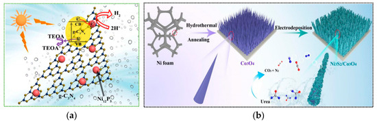 The construction of heterojunctions optimizes the separation and transfer of photogenerated charge carriers through interface band engineering, which is a key strategy to improve photocatalytic efficiency. The principle is based on the band alignment of different semiconductor materials (such as p-n type, Schottky junctions, or Z-scheme heterojunctions). Band bending creates an internal electric field that drives the efficient separation of e−-h+ pairs and suppresses recombination. Huang et al. [101] synthesized branched Ag-ZnO heterojunction nanostructures using a one-pot method, using (Zn(NO3)2·6H2O and AgNO3) as precursors and diethanolamine as a structural directing agent. The reaction was carried out at 180 °C for 12 h to successfully prepare the branched Ag-ZnO heterojunction. The branched Ag-ZnO heterojunction’s unique morphology helps enhance photogenerated charge carrier separation and surface reaction activity, providing important insights for the synthesis and application of other branched metal/semiconductor heterojunction nanostructures. Qin et al. [102] used ultrasound-assisted mixing to combine Ni12P5 nanoparticles with porous g-C3N4 in a DMF/hexane/ethanol solution, followed by centrifugation and vacuum drying at 120 °C for 6 h to construct a tightly bound heterojunction (as shown in Figure 9a). This resulted in a visible-light-driven hydrogen production activity of 535.7 µmol g−1·h−1 (AQY = 4.67%). The excellent performance is attributed to efficient charge separation, providing a new approach for the design of non-precious metal photocatalysts. Yi et al. [103] electroplated Ni3S2 nanosheets onto a Co3O4-NF substrate using cyclic voltammetry, washed the product with water, and then vacuum-dried it at 60 °C for 12 h to obtain Ni3S2/Co3O4. This was used to construct a foam nickel-supported Ni3S2/Co3O4 p-n heterojunction catalyst (as shown in Figure 9b). The built-in electric field at the interface creates electrophilic/nucleophilic regions, promoting urea adsorption and decomposition. The catalyst achieved 10 mA cm−2 at only 1.288 V and operated stably for 100 h, providing a new approach for the design of efficient UOR catalysts. Liu et al. [104] constructed an Ag-Ag2Se@CdSe double Z-scheme heterojunction with TiO2 as the support using multiple methods. The synergistic plasmonic effect enhanced charge carrier separation, achieving 99% degradation of tetracycline (within 120 min), 51.64 μmol·g−1·h−1 hydrogen production, and efficient antibacterial performance. Tong et al. [105] developed an ionic carbon-nitride catalyst, 2%Ox-KPHI, which achieves an apparent quantum efficiency of 41% at 410 nm through structural distortion and defect site introduction for the highly efficient photocatalytic synthesis of H2O2 without the need for a co-catalyst. Metal-semiconductor heterojunctions, semiconductor-semiconductor heterojunctions, and oxide-oxide heterojunctions can enhance the stability of catalysts due to their different structures.
