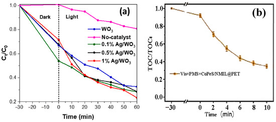 Nanostructured photocatalysts significantly enhance the degradation efficiency of pollutants through light energy, showing broad application prospects in environmental remediation. In the field of environmental restoration, these catalysts are widely used in water pollution treatment and the efficient degradation or reduction in heavy metal ions (such as Hg2+, Ag+) to non-toxic substances, while also enabling the recycling of heavy metals. Matalkeh et al. [75] prepared silver nanoparticles on WO3 through a deposition-precipitation method. The synthesized catalyst exhibited excellent methylene blue degradation performance (Figure 11a shows the degradation curve of MB, with approximately 80% degradation efficiency) and antibacterial activity, showing significant inhibitory effects against E. coli and S. aureus. It also demonstrated good stability and reusability. Alpro et al. [34] used algae to green-synthesize metal oxide nanoparticles (MONPs), which offer both environmental friendliness and cost-effectiveness. Compared to plants and fungi, algae are easier to scale up and can efficiently produce multifunctional materials. When combined with photocatalytic technology to degrade industrial wastewater pollutants, they provide advantages such as fast oxidation and low byproduct formation, offering a sustainable strategy for water remediation. Sun et al. [111] developed a photocatalytic self-supported Fenton system based on a 2D/2D Bi2Fe4O9/ZnIn2S4 van der Waals S-type heterojunction. The system achieved an 88.8% tetracycline degradation rate under visible light, significantly improving photogenerated charge carrier separation and Fe3+/Fe2+ conversion efficiency and showing potential for formaldehyde degradation. Wu et al. [112] developed a CoPcS/NMIL@PET superhydrophobic nanofiber membrane with self-cleaning and multifunctional properties. The membrane achieved over 99% oil-water detergent separation efficiency under gravity filtration and enabled efficient self-cleaning and formaldehyde degradation under visible light. It also showed a high TOC removal rate (as shown in Figure 11b) and exhibited excellent stability and reusability. Xue et al. [113] developed a photo-Fenton synergistic system by growing FeOOH nanoneedles on the surface of biochar using a two-step carbonization-hydrothermal method. Under visible light, the system degraded 92% of tetracycline in 90 min (H2O2 promotes the Fe3+/Fe2+ cycle), with ·OH and h+ as the active species. The system also demonstrated excellent magnetic recoverability, providing a new strategy for the treatment of antibiotic wastewater. Ullah et al. [35] synthesized Co3O4/ZnO heterojunctions through co-precipitation of chitosan/PVP, enhancing the specific surface area and suppressing charge recombination. The 4% CS system achieved 83.33% degradation of RhB under visible light and a 7.75 mm antibacterial zone. Molecular docking revealed that the antibacterial mechanism is mediated by inhibiting TyrRS and DNA gyrase.