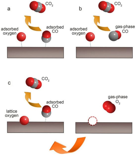 Three typical kinetic models of the CO oxidation process: (a) Langmuir–Hinshelwood model; (b) Eley–Rideal model; (c) Mars–van Krevelen model (Reproduced with permission from reference [63]).