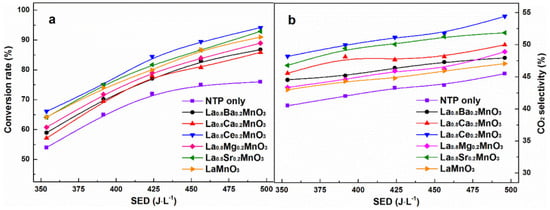 Among perovskite catalysts, LaMnO3 has received extensive attention due to its thermal stability, the mixed valence state of the transition metals, and its oxygen migration ability and has become the basic catalyst for doping modification. Zhu et al. synthesized a series of A-site-substituted La0.8M0.2MnO3 catalysts (M = Ba, Ca, Ce, Mg and Sr) by the sol-gel method and conducted catalytic oxidation tests of ethyl acetate in a dielectric barrier discharge reactor [92]. Compared with pure LaMnO3, the La0.8M0.2MnO3 catalysts exhibit higher adsorbed oxygen content, and only doping with Ce and Sr can improve the reducibility of the catalysts; as shown in Figure 6, among these catalysts, La0.8Ce0.2MnO3 shows the highest ethyl acetate conversion and CO2 selectivity, indicating that the reducibility of the catalyst plays an important role in determining the reaction performance of the plasma catalytic oxidation process. In LaMnO3, using Al to substitute the A-site cations is also beneficial in improving the catalytic performance. Chen et al. prepared a series of aluminum-substituted La1−xAlxMnO3 (x = 0–0.3) catalysts by the sol-gel method [93]. The improvement in reducibility is conducive to the activation of oxygen species, and the high surface acidity can promote the chemisorption of 1,2-dichloroethane. The synergy of both leads to the enhanced catalytic activity of La1−xAlxMnO3. It can be observed in Figure 7 that doping Al in the catalyst increases the content of high-valent Mn4+ substances, which is closely related to the enhancement of the reducibility of the catalyst.