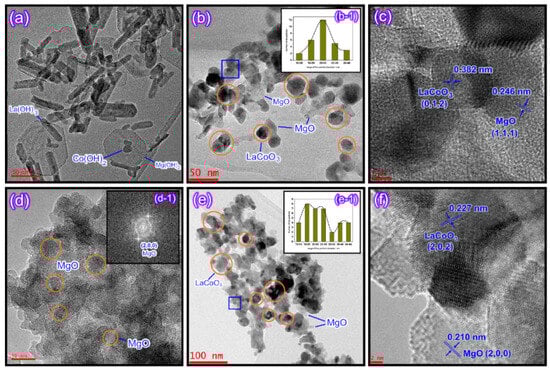 HR-TEM images of (a) A-sc-LCM sample, (b) sc-LCM sample, (d) A-cr-LCM sample and (e) cr-LCM sample; (b-1) and (e-1) represent the corresponding particle size distribution; (d-1) shows a fast Fourier transform pattern of MgO in the A-cr-LCM sample; (c,f) show the d-spacing of LaCoO3 and MgO in the sc-LCM and cr-LCM samples, respectively. (Reproduced with permission from reference [97]).