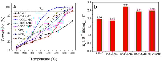 Tian et al. synthesized CrOx/LaSrMnCoO6 catalysts with different loadings, enabling LaSrMnCoO6 to combine the advantages of the high activity and chlorine resistance that CrOx possesses [98]. This catalyst was used for the first time in the deep oxidation of 1,2-dichloroethane. As shown in Figure 11a, due to the fact that the 10 wt.% CrOx/LaSrMnCoO6 (10Cr/LSMC) catalyst has a relatively large number of Cr6+ species, high reducibility, excellent adsorption capacity for 1,2-dichloroethane, and a large amount of surface-active lattice oxygen species, and the presence of Cr6+ promotes the interaction between the surface lattice oxygen and LaSrMnCoO6, 90% of 1,2-dichloroethane is completely decomposed at 400 °C. Similarly, Figure 11b also shows that the reaction rate of 10Cr/LSMC is the highest. During the oxidation of 1,2-dichloroethane, the main reaction by-products detected are vinyl chloride, 1,1,2-trichloroethane, trichloroethylene, and perchloroethylene, but they can be completely oxidized into CO, CO2, H2O, HCl, and Cl2. The introduction of CrOx into LaSrMnCoO6 accelerates the oxidation process of 1,2-dichloroethane and reduces the generation of by-products. At the same time, it also shows excellent durability and water resistance.