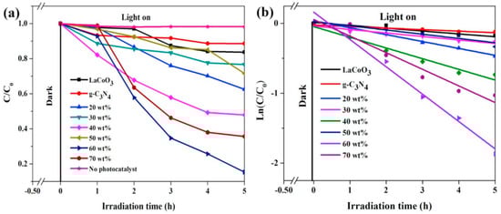Jin et al. prepared a Z-scheme LaCoO3/g-C3N4 heterojunction photocatalyst through a one-step impregnation method and tested its performance in degrading phenol under visible light [104]. As shown in Figure 12a, the LaCoO3/g-C3N4-60 wt% composite catalyst exhibits the best activity, with a phenol degradation rate of 85% within 5 h, which is 5.2 times and 7.5 times that of pure LaCoO3 and g-C3N4, respectively. Meanwhile, the photocatalytic degradation process of phenol follows pseudo-first-order kinetics (Figure 12b). The figure shows that the content of g-C3N4 has a great influence on photocatalytic activity. A g-C3N4 content of 60 wt% is most favorable for the formation of more heterostructures between LaCoO3 and g-C3N4, which facilitates the separation of photogenerated charge carriers and enhances the photocatalytic activity.