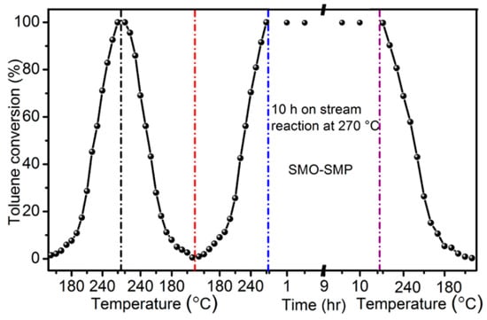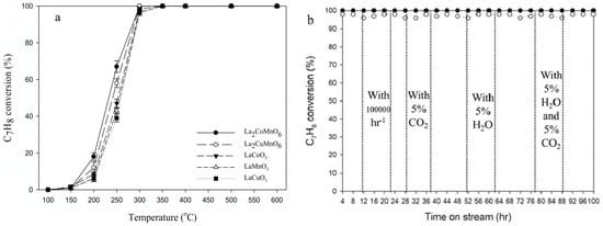 Pan et al. prepared double perovskite catalysts, including La2CoMnO6 and La2CuMnO6, by the improved Pechini method [114]. In a fixed-bed reactor, using toluene and other VOCs as target pollutants, under different conditions such as temperature, gas hourly space velocity (GHSV), and the contents of CO2 and H2O, a Fourier transform infrared spectrophotometer and a CO2 analyzer were used to measure the concentrations of reactants and products, and the removal efficiency and CO2 yield were calculated to test their activity. The durability test was carried out at 300 °C with a GHSV of 30,000 h−1 and containing 5% CO2 and 5% H2O. The double perovskite catalysts have better activity and lower activation energy than single perovskite catalysts. The test results are shown in Figure 13; La2CoMnO6 can completely oxidize toluene into CO2 at 300 °C. In the durability test, La2CoMnO6 and La2CuMnO6 maintain a toluene removal efficiency of 100% and 98%, respectively.