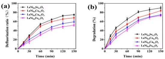 Co-doping at the A- and B-sites can simultaneously achieve the structural adjustment of the catalyst and the electronic modification of the perovskite oxide. Ali et al. synthesized La0.8A0.2Mn0.3B0.7O3 (A = Sr, Ce; B = Cu, Fe) by the sol-gel auto-combustion method [96]. After Mn is partially replaced by other elements, the oxygen vacancies of the catalyst increase, thus changing its surface structure and improving its reducibility. The partial substitution of Sr and Ce at the A-site of the perovskite catalyst also enhances their activity for the oxidation of toluene. The introduction of Sr2+ and Ce4+ at the A-site of the perovskite increases the relative contents of Cu2+, Fe3+, Mn4+, and Oads in the catalyst, and changes the reducibility of the cations at the B-site. These factors will cause defects in the perovskite structure, leading to higher catalytic performance. As can be observed in Figure 9, for the catalytic oxidation of toluene, the iron-containing perovskite catalyst exhibits higher activity than the copper-containing perovskite. Among them, La0.8Ce0.2Mn0.3Fe0.7O3 has the highest activity, and this catalyst achieves a 100% toluene removal rate at 200 °C.