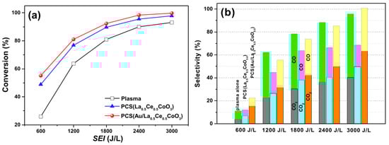 - Zhu, B.; Li, Q.W.; Li, Y.C.; Xia, Y.Q.; Liu, J.L.; Zhou, A.M.; Zhang, X.M. Improving oxidation removal of toluene in plasma coupling perovskite catalysts system by constructing Au sites on a La0.5Ce0.5CoO3−δ. Chem. Eng. J. 2023, 469, 143897. [Google Scholar] [CrossRef]