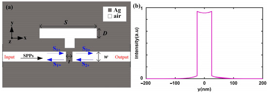 Figure 1a presents a two-dimensional (2D) model of the plasmonic configuration, which consists of a metal–insulator–metal (MIM) waveguide integrated with a subwavelength resonator (SR) and a metallic baffle. The whole structure is infinite in the z direction. In this structure, the SR is positioned directly above the bus waveguide, which is split into two MIM waveguides by a silver baffle. The geometric parameters of the plasmonic waveguide system include the width and length of the resonator (D = 50 nm and S = 450 nm), the width of the silver baffle (t = 20 nm), and the width of the bus waveguide (w = 50 nm). In Figure 1a, the gray and white regions represent silver (εAg(ω)) and air (εair = 1.0), respectively. The dielectric constant of silver is described by the Drude model [29]: εAg(ω) = ε∞ − ωp2/(ω(ω + iγ)), where ω is the angular frequency, ωp = 9.1 eV is the bulk plasma frequency, ε∞ = 3.7 is the permittivity at infinite angular frequency, and γ = 0.018 eV is the electron collision frequency. These parameters are consistent with the optical constants reported in Ref. [30], where the optical data for silver aligns with experimental results in the wavelength range of 700~1300 nm.