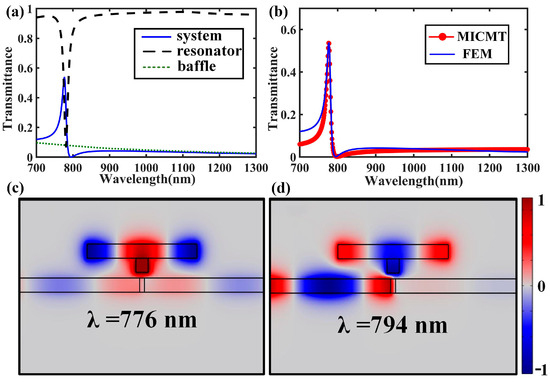 (a) Transmission spectra of the proposed plasmonic system, single side resonator, and the metallic baffle. (b) Transmission spectra of the proposed plasmonic structure calculated by the MICMT (red circle line) and FEM (blue line) methods. (c) The normalized field distributions for the z-component of the magnetic field (Hz) at the peak wavelength of λ = 776 nm (maximum Fano resonance). (d) Hz distributions at a dip wavelength of λ = 794 nm (minimum Fano resonance).