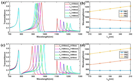 Then, we controlled w2 by changing L1 (L2 = 190 nm). Figure 6a,b show the transmission spectra of the improved plasmonic structure with different values of L1. The results show that the resonant wavelength of FR1 remained unchanged, while FR2 exhibited a nonlinear blue shift from 971 nm to 919 nm. As L1 varied from 310 nm to 350 nm, the width w2 changed from 60 nm to 80 nm, and the effective refractive index decreased for the mode distributed along the y direction in the SRR. Consequently, FR2 exhibited a nonlinear blueshift with the increase in L1, a trend that can be anticipated from Equation (6). On the contrary, the resonant wavelength of FR3 exhibited a linear redshift from 1105 nm to 1216 nm. This is because when L1 increased, the outer wall of the SRR increased linearly, while the effective refractive index at the corner remained unchanged. Finally, we kept w2 = 70 nm unchanged while changing L1 and L2. With the increase in L1 and L2, FR2 exhibited a redshift from 892 nm to 991 nm, and FR3 exhibited a redshift from 1102 nm to 1218 nm, as shown in Figure 6c,d. The above results indicate that the improved plasmonic waveguide system can serve as a band stop filter for different frequency bands due to the tunable ability of the multiple Fano resonances and the ultra-low broad transmission dip.