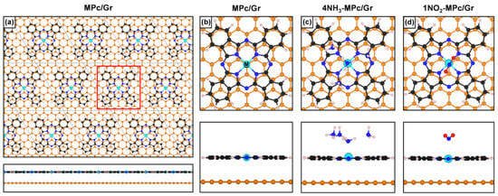 Ball-and-stick models of the optimized geometries for (a,b) MPc/Gr, (c) 4NH3-MPc/Gr, and (d) 1NO2-MPc/Gr. Color scheme: graphene C atoms are shown in orange; metal cations (M) in cyan; C, N, and H atoms in the MPc molecule are black, blue, and white, respectively; NH3 nitrogen and hydrogen atoms are blue and white; NO2 nitrogen and oxygen atoms are blue and red.