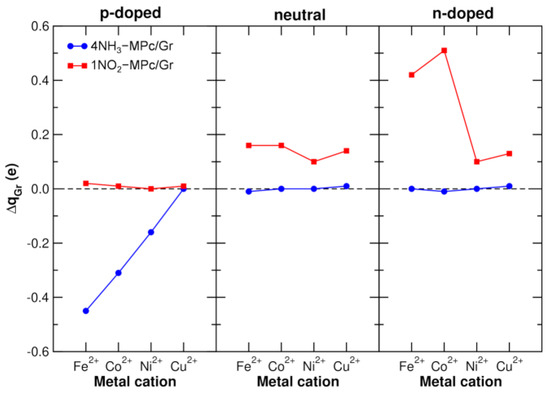 A straightforward method to assess the sensitivity of different MPc/Gr systems to NH3 is to compute the charge variation in Gr, which reflects changes in the charge carrier density before and after NH3 exposure. In Figure 6 (blue points and lines), we present the charge variation on the Gr layer (where ΔqGr = qGr,4NH3-MPc/Gr − qGr,MPc/Gr), calculated using the Bader partition scheme [70], for each considered doping level: p-doped, neutral, and n-doped. When ΔqGr = 0, there is no charge transfer to Gr, while a positive/negative value implies that Gr is losing/gaining electrons. Any charge transfer will affect the charge carrier density in the Gr layer. For instance, in the p-doped case, some electron transfer to Gr reduces the number of holes (the majority charge carriers), resulting in an increase in resistance. Conversely, in the n-doped case, some electron transfer to Gr increases the number of electrons (the majority charge carriers), leading to a decrease in resistance. Thus, the resistance change is directly linked to the doping level and the nature of charge transfer, providing valuable insights into the sensing capabilities of the system.