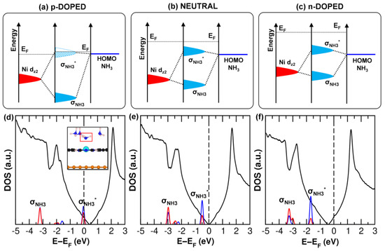 In Figure 7a–c, we present the schematic representation of the orbital alignment before and after mixing upon NH3 adsorption at different doping levels. The three qualitative pictures are based on the calculated project DOS (PDOS) of Gr, the coordinating NH3 molecule, and the Ni dz2 orbital in Figure 7d–f. Going from the p-doped to neutral and to n-doped Gr, the Fermi level becomes higher in energy from the HOMO of the gas-phase NH3 (Figure 7a–c). Once the NH3 adsorbs on the metal atom, the resulting σ* state is sufficiently high in energy to allow charge transfer to Gr only in the case of p-type doped Gr, which gains electronic charge from NH3. In contrast, for the n-doped and neutral cases, the σ* state is far below the Fermi level. This analysis addresses question (1) above.